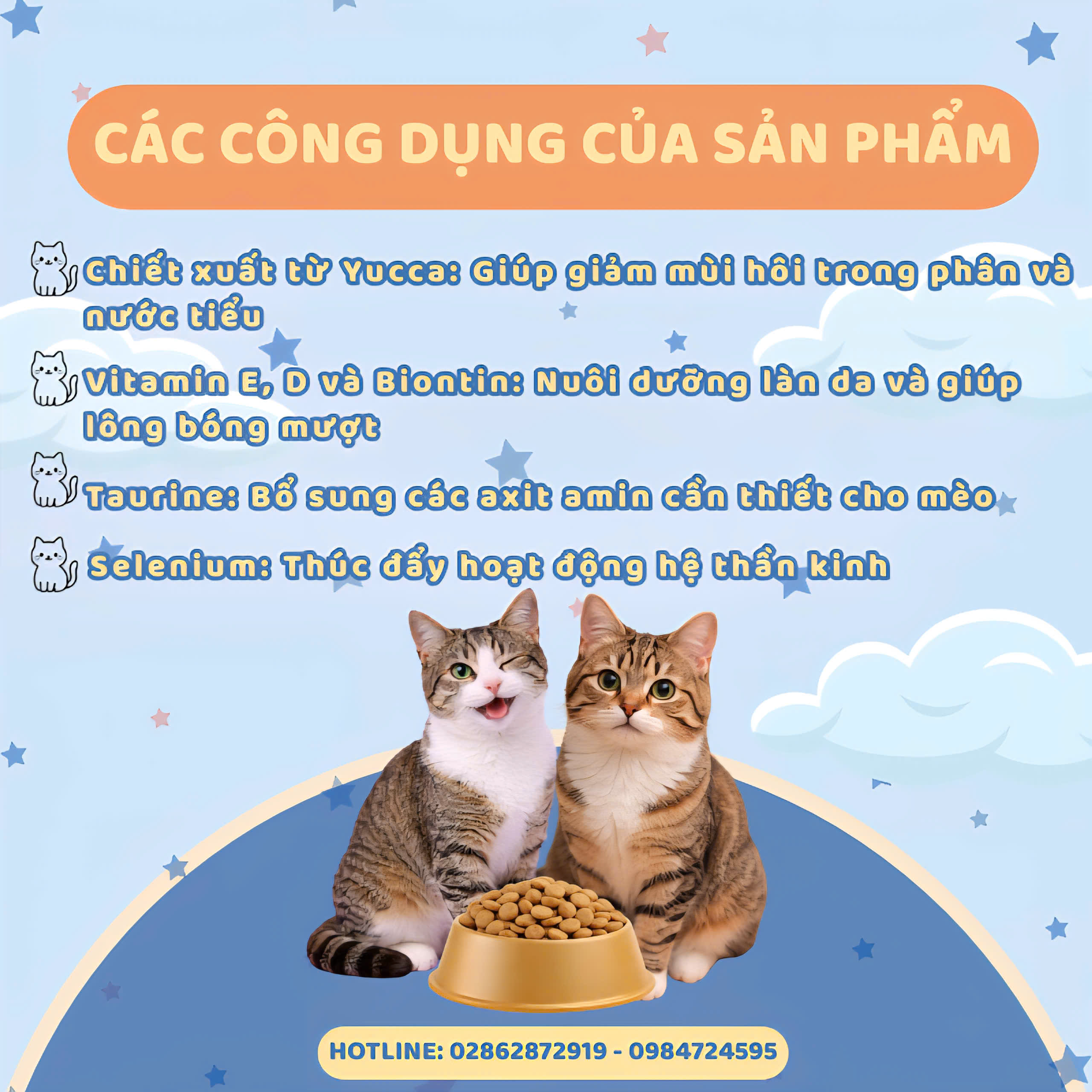 Giúp kiểm soát và giảm mùi hôi trong phân và nước tiểu, góp phần giữ môi trường sống sạch sẽ, dễ chịu cho mèo và gia đình |